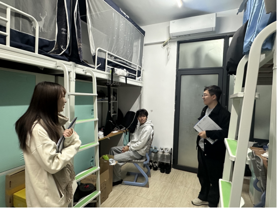 检查过程中,辅导员老师认真查看学生宿舍用电安全、物品摆放以及卫生状况,并与学生亲切交流,了解他们的日常生活和学习情况,强调保持宿舍整洁和安全的重要性,提醒学生注意冬季用电安全,避免使用违规电器,确保消防通道畅通无阻。学生党员也积极参与其中,发挥模范带头作用,协助辅导员记录发现的问题并提出改进建议。