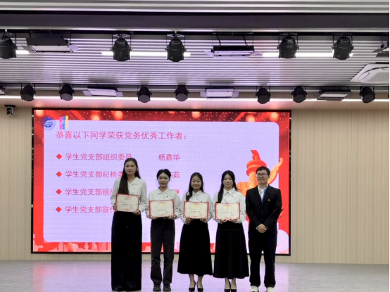 会上,全体同志共同观看换届视频,回顾了学生党支部过去一年的高光时刻与工作成果,彰显了组织团队奋进、锐意进取的良好风貌。音乐舞蹈学院党总支副书记刘国杰老师、学生党支部书记陈菀忻老师、团总支书记卢晓雯老师为各位优秀党务工作者、工作积极分子以及三下乡工作积极分子颁奖。