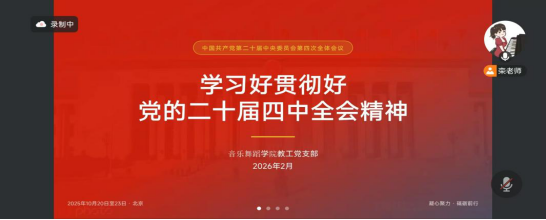 为深入学习贯彻党的二十届四中全会精神,以高质量党建引领艺术教育育人工作走深走实,2026年2月24日,广州理工学院音乐舞蹈学院教工党支部以线上形式召开党的二十届四中全会精神专题学习会。会议由教工党支部书记栾鸾主持,党总支副书记全艳作重点强调,学院全体党员教师参会。
