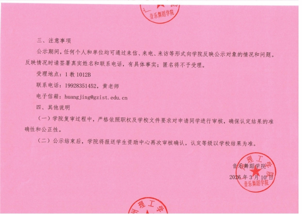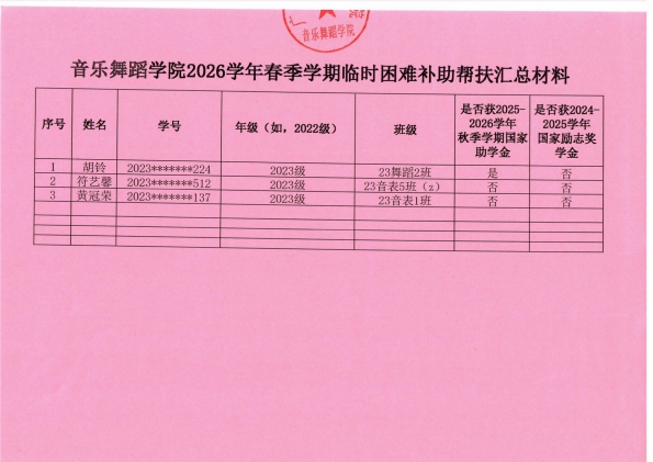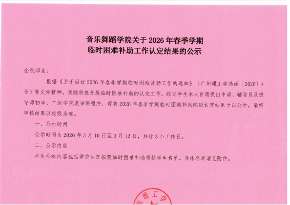 音乐舞蹈学院关于2026年春季学期临时困难补助工作认定结果的公示