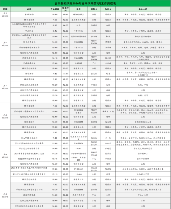 音乐舞蹈学院2026年春季学期第7周工作周程表