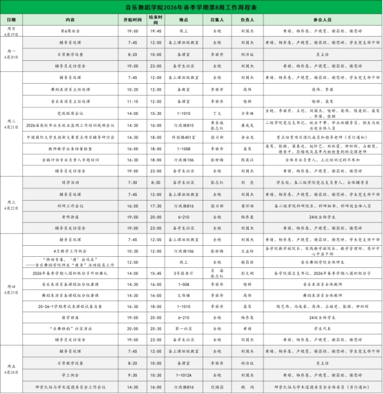 音乐舞蹈学院2026年春季学期第8周工作周程表