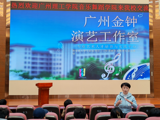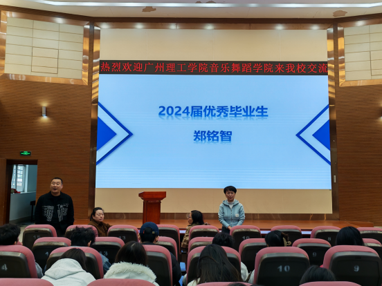 首先,广州科技贸易职业学院艺术设计学院党总支书记罗裕光、副院长赵越、钢琴教研室主任罗颖馨、钢琴教师胡淑琴热情接待我们,亲切地就两个学校之间的共性、合作问题展开探讨,并对在广州理工学院继续深造的毕业生目前的学习生活情况进行大致了解。10点30分,宣讲活动正式开始,赵越副院长向同学们介绍了宣讲团成员并表示欢迎,由李丽丹副院长主持宣讲活动。钟艺娜主任饱含激情对音乐舞蹈学院大致情况进行简要介绍,并详细介绍音乐舞蹈学院的重量级名师,对音乐表演与舞蹈表演专业的主修课程、就业方向、实训以及教学场地、艺术实践活动、学科竞赛活动进行图文并茂地展示。优秀学生代表郑铭智进行简要发言,对于广州理工学院音乐舞蹈学院的硬件设施、教师队伍、课程设置表示了肯定,并以优秀学长身份对于学弟学妹进行寄语与祝福。
