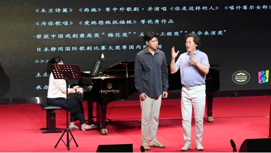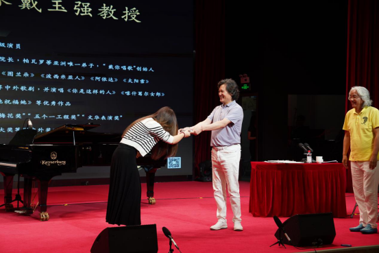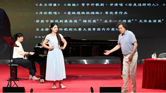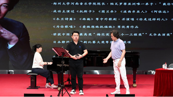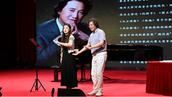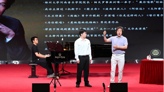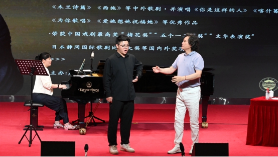 在全场热烈的掌声中,戴玉强教授围绕歌唱艺术展开理论分享。他结合自身多年舞台实践与教育经验,从科学发声的基础原理、情感表达与演唱技巧的融合等方面,用通俗的语言讲解专业知识——既点明了歌唱学习中需规避的常见误区,如发声位置不当、情感表达与技巧脱节等问题,也分享了提升艺术表现力的核心思路,例如如何通过细腻的情感把控增强作品感染力。这些内容让在场师生对歌唱艺术有了更系统、更深入的认知。理论分享结束后,讲座进入实操指导环节,戴玉强教授先后邀请周凌志、潘梓健、符梅凤、林翊四位教师及陈彦伊、伍心茹两位学生上台展示演唱片段,并从气息控制、音准把握、情感传递等专业角度逐一点评指导,提出针对性改进建议,让师生们在互动中直观学习专业技巧。