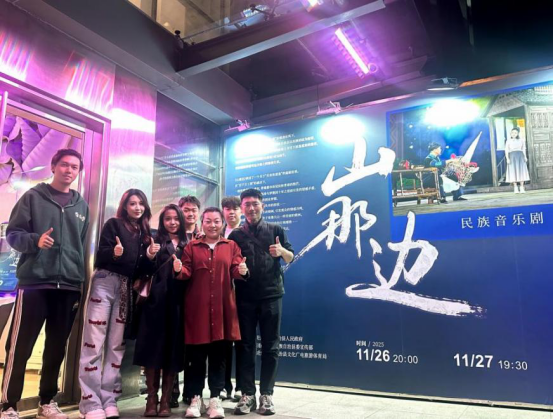 11月26日晚,由音乐舞蹈学院深度参与创作与演出的大型民族音乐剧《山那边》在广东艺术剧院隆重开演,现场座无虚席。此次演出不仅为学子搭建了高水平艺术实践平台,更以实战锤炼技能、提升了就业竞争力,同时彰显了学院专业实力与行业影响力。音乐舞蹈学院副院长李丽丹带队青年教师及学生代表到场观摩。