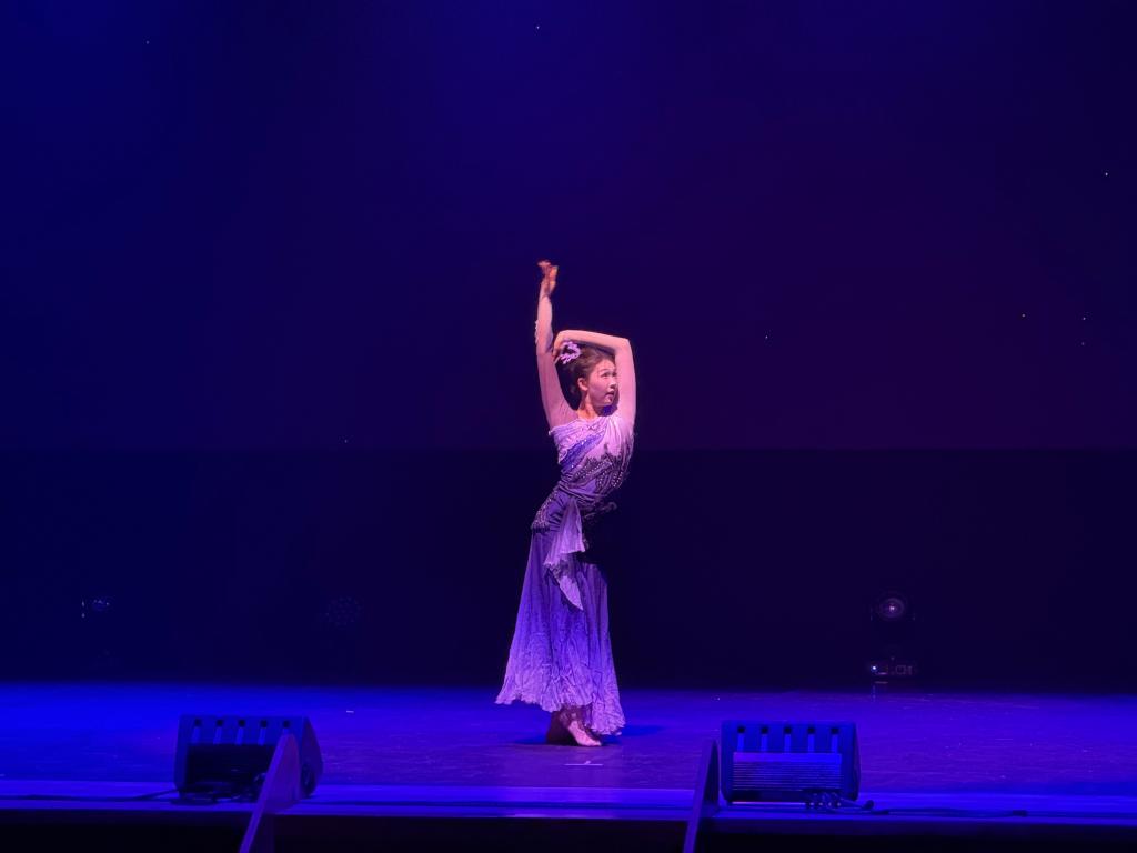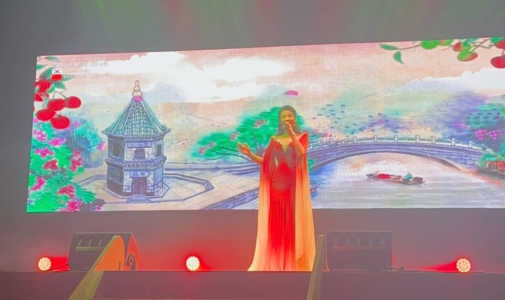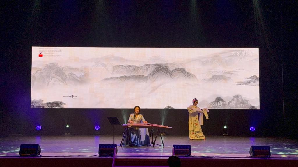 当晚以“鸡龙别曲”为主题的 2025国际文化艺术交流晚会盛大启幕。鸡龙市市长李应雨、忠清南道道议员李载云、鸡龙市议会议长金犯圭等当地政要以及国防产业研究院李忠鎬院长、鸡龙市文化院院长林英宇、鸡龙市体育会会长郑俊永、鸡龙市议员金美贞、鸡龙市议员张龙德、鸡龙市议员申东元、鸡龙市议员李元珠、全北中国人协会朱春梅会长,全北中国人协会刘译骏副会长、青龙艺术团申惠庆代表悉数出席。整场晚会共呈现 11个精品节目,韩方青龙艺术团带来传统音乐合奏《南道巷歌》、传统剑舞《刀剑舞》《蝴蝶舞》《僧舞》等经典节目,尽显韩国传统艺术的典雅韵味。而广州理工学院代表团献上的 6 个极具岭南特色的节目,更是成为晚会的高光时刻 —— 男团演绎的《席狮舞》气势恢宏,独舞《逐浪》灵动飘逸,古筝戏曲伴舞《高山流水》意境悠远,独唱粤曲《荔枝颂》韵味醇厚,《瑶鼓舞》热情奔放,《英歌舞》铿锵有力,每一个节目都赢得台下阵阵雷鸣般的掌声与欢呼声。