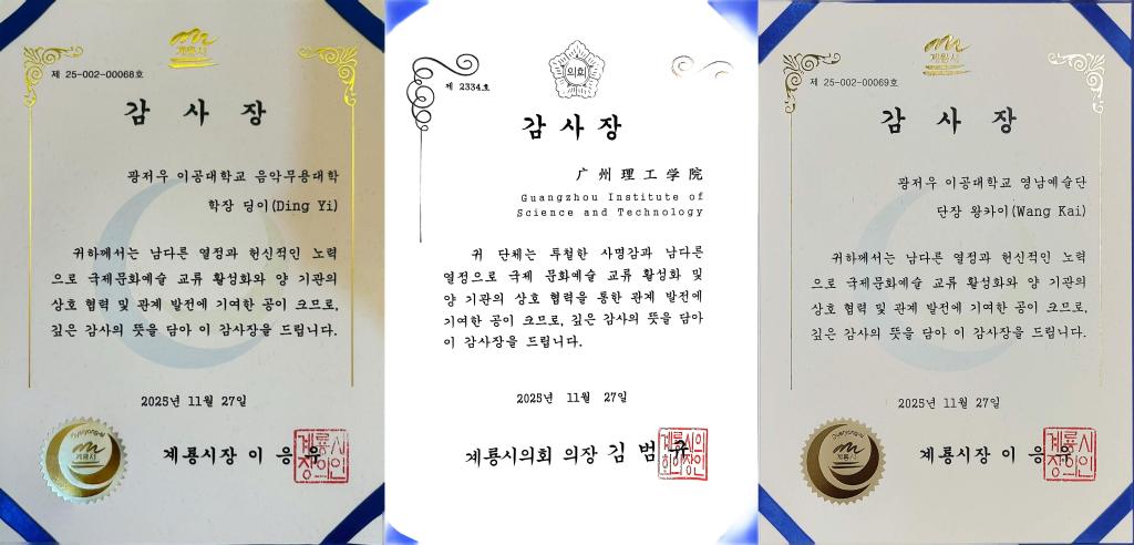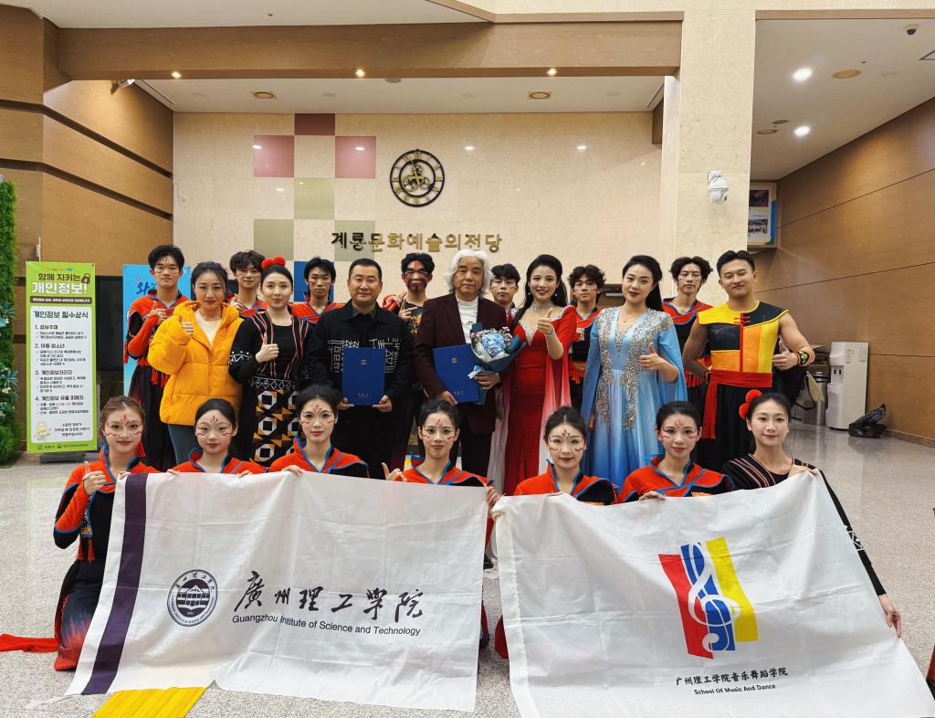 11月27日,广州理工学院音乐舞蹈学院师生受韩国鸡龙市政府邀请抵达韩国鸡龙文化艺术殿堂进行文化交流。作为鸡龙市政府极具影响力的系列国际文化交流活动,此次邀约延续了其高品质的跨国合作传统——2023 年曾邀请蒙古国国立艺术团到访,2024 年迎来马来西亚艺术团交流,2025年则将这份文化邀约赠予广州理工学院艺术团。本次活动由丁义院长担任艺术总监,王恺副院长担任团长,率领广州理工学院喻娇、周旭、李雨晨、赵轩艺、胡慧洁5位教师及14名舞蹈系优秀学生作为广州理工学院艺术团代表出席活动,以精湛才艺搭建中韩文化交流的坚实桥梁。鸡龙市位于大韩民国忠清南道,是韩国唯一汇集陆、海、空三军本部的“国防首都”,在国家战略与军事文化领域具有举足轻重的地位。