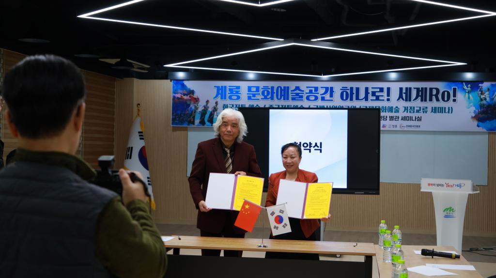 韩国时间活动首日上午,一场高规格的文化交流座谈会在鸡龙文化艺术殿堂会议厅隆重召开。广州理工学院丁义院长、王恺副院长与韩国国防产业研究院李忠鎬院长、全北中国人协会朱春梅会长、刘译骏副会长、鸡龙市文化院林英宇院长、青龙艺术团申惠庆代表等嘉宾齐聚一堂,共话中韩文化艺术发展。座谈会上,丁义院长与青龙艺术团申惠庆代表正式签署友好交流协议,为两国艺术界长期合作奠定坚实基础。随后,喻娇老师一曲独具岭南特色的客家筝曲《出水莲》与许思茵同学灵动的藏族舞蹈《玛旁雍措》精彩上演,以艺术为媒,拉开了中韩文化友好交流与未来展望的序幕。