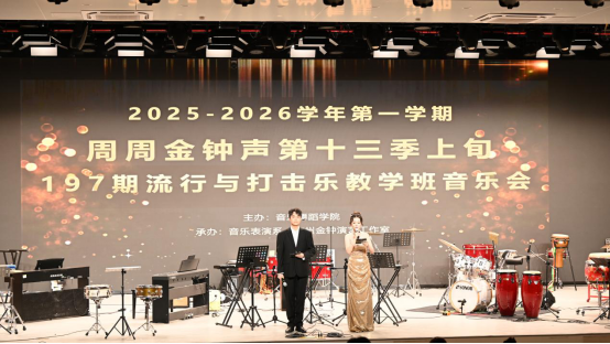 2025年11月27日晚,197期流行与打击乐教学班音乐会在13栋1号报告大厅隆重开场。音乐舞蹈学院副院长李丽丹、蔡云凌、余俊泓、史文铮、朱海明、赵南颖、金家玉、胡佳艺等老师与部分音乐系学生共同观看音乐会。