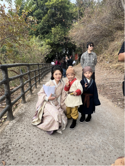 表演创作方面,魏凌极与郭梓仪老师分别塑造了剧中古代戏部分的男女主人公邓大人与邓夫人。此次赴霍山拍摄共有 30 名同学参与,其中刘佳扬、李泊霖、孙福亮、陈伟康、郭涵琛、赖锦灏、杨贝贝、李轩轩、陈卓兴等同学担任主要角色,特邀小演员颜檬、颜柠两位5岁小朋友饰演幼年邓绥与邓大人之子,其余同学化身群众演员,在不同场景中切换身份,一人分饰多角毫无怨言。值得一提的是,谢榕同学身兼导演助理与演员双重身份,一方面高效协调同学们的拍摄时间,保障剧组进度;另一方面客串幼年邓绥与难民等角色,表演沉稳自然、情感真挚,获得全体师生的一致好评。拍摄期间,当地早晚温差较大,全体师生不畏寒冷与炎热天气,严格遵守剧组纪律,在野外环境下反复打磨每一个镜头,用专业与坚持确保了古代戏部分画面质感与剧情张力的完整呈现。